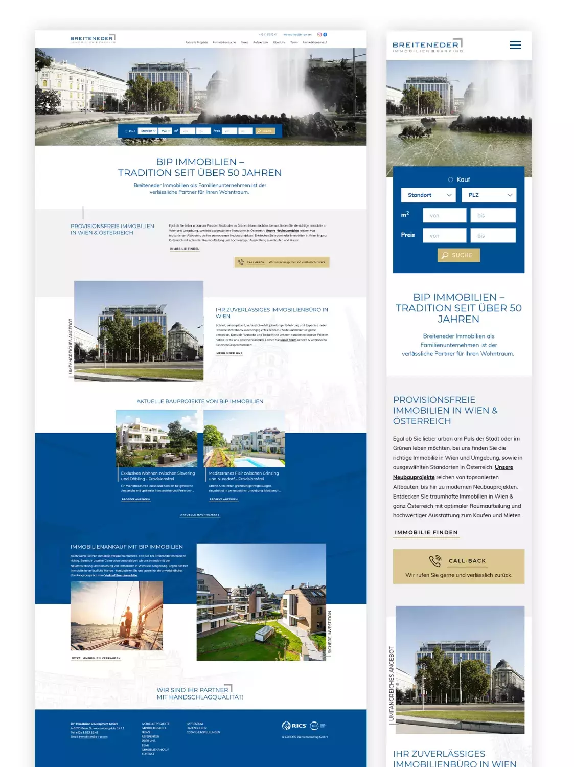 Webové stránky pro rakouského developera. Stránky jsou napojeny na externí systém, který poskytuje nabídku objektů a projektů, které jsou dále zobrazovány na webu, ve kterém lze vyhledávat a filtrovat pomocí veliké nabídky možností. Správce na webu spravuje pouze novinky. Každý projekt umožňuje interaktivní navigátor pro procházení budovy, propojení samotných objektů na projektu a body zájmu řešeném pomocí Google map.