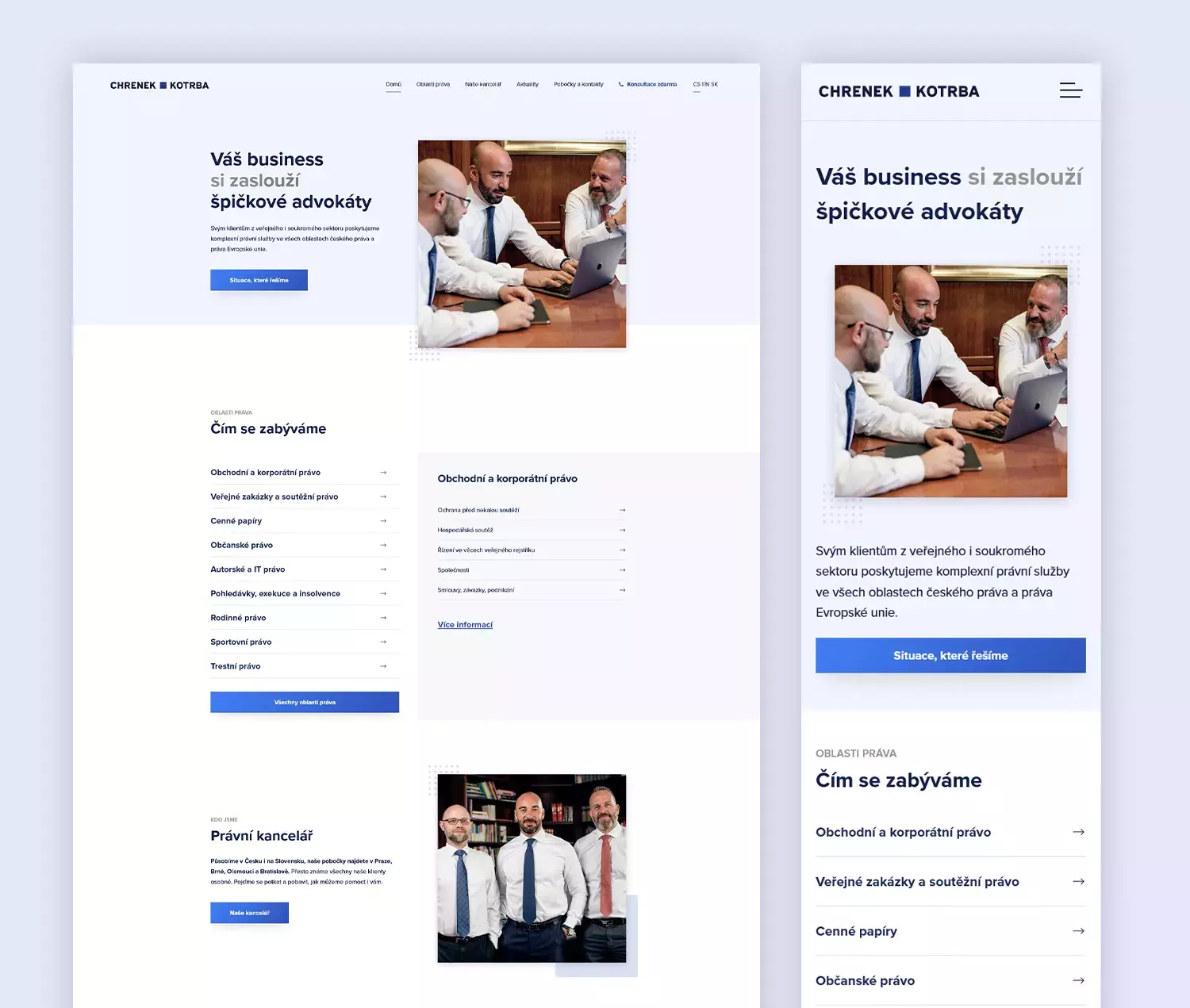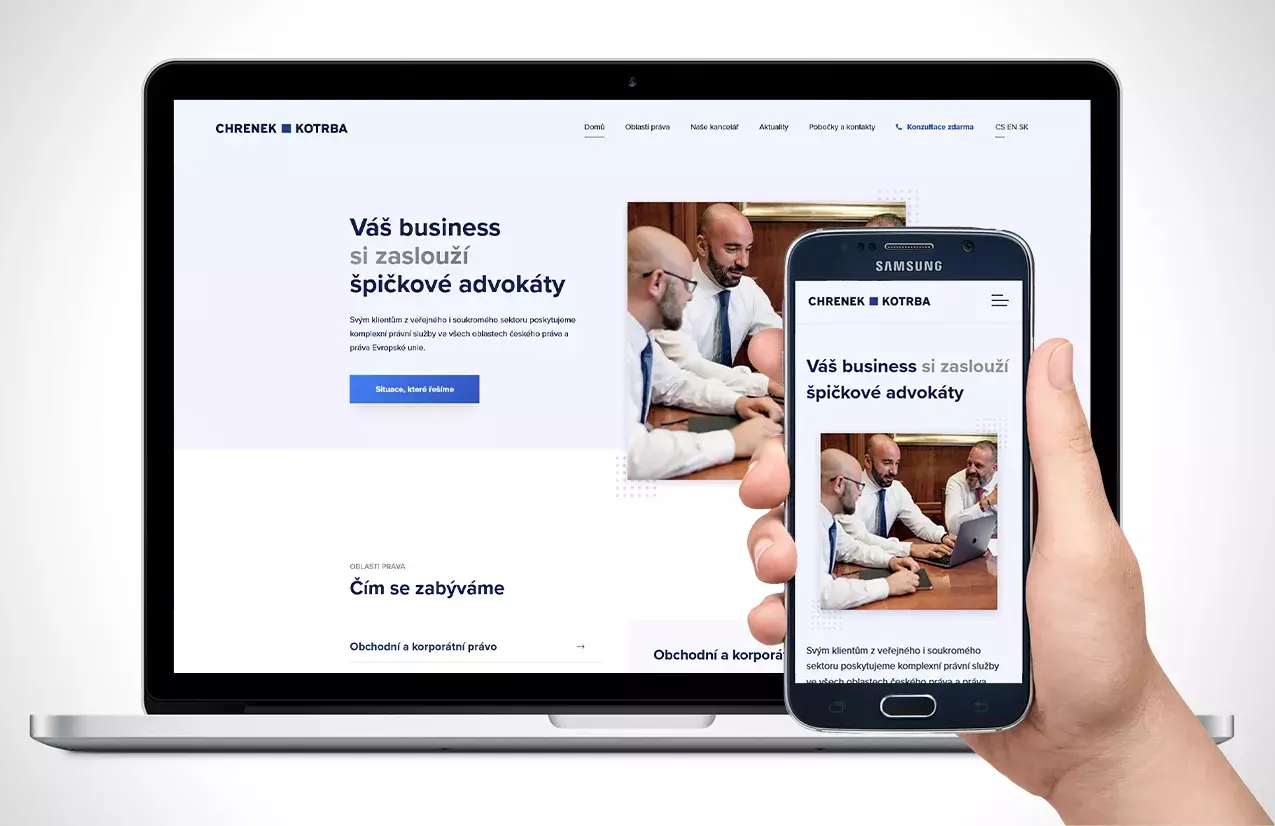 Webové stránky advokátní kanceláře Chrenek Kotrba realizované ve třech jazykových mutacích s& přehledným dělením služeb a kontaktních osob. Web se dostává do popředí první stránek vyhledávání na jednotlivá klíčová slova služeb. Zobrazit web