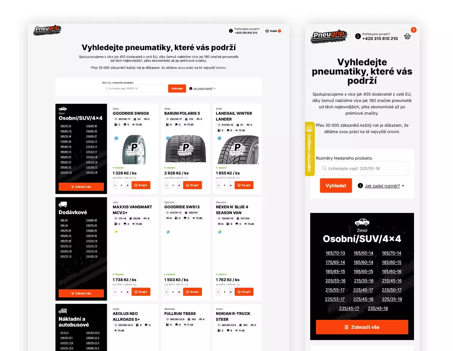 Tvorba e-shopu pro prodej pneumatik na území ČR a SK. Nabídka pneumatik je automaticky plněna z externího zdroje, který zároveň řeší skladové hospodářství, objednávky, cenotvorbu a je také z naší produkce. Tento centrální bod pak nahrazuje správu obsahu v jakémkoliv e-shopu zapojeném do jeho rodiny. E-shop je plně napojen pro Heureku, dopravce, platební bránu a mnoho dalšího.