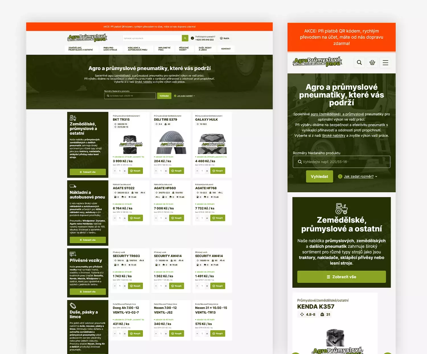 - Katalog produktů – Podrobný přehled agroprůmyslových pneumatik s filtrováním podle parametrů jako je rozměr, typ pneumatiky, určení (zemědělské, stavební, průmyslové apod.).