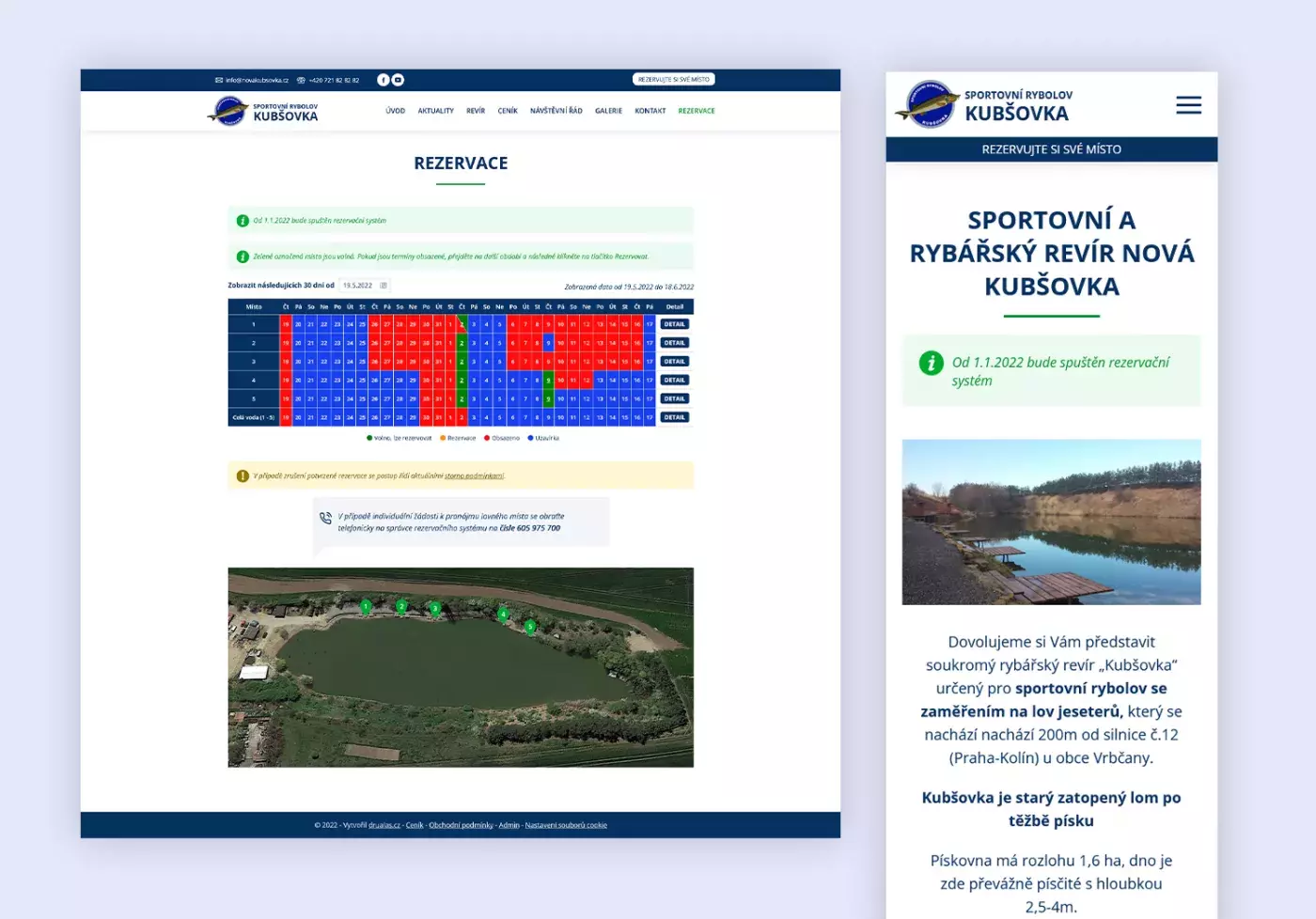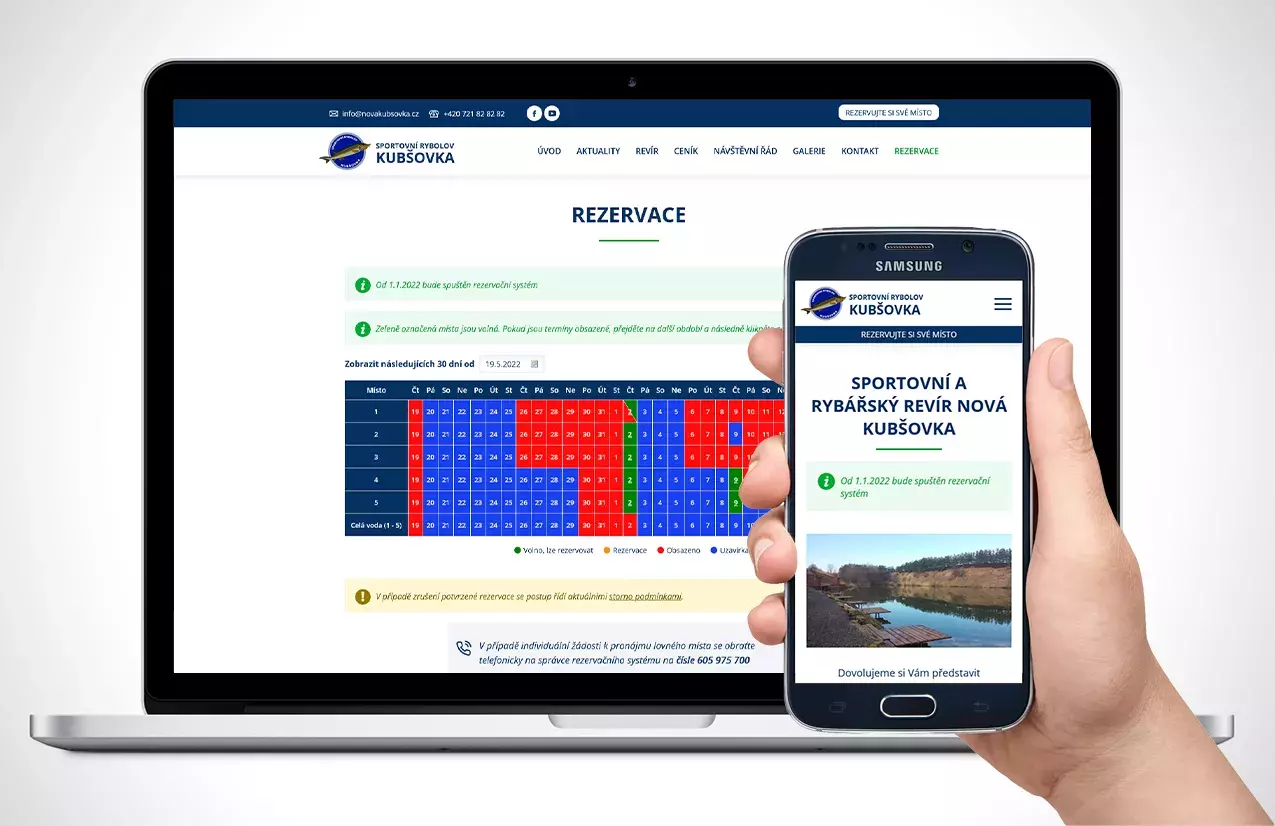 Rezervační systém pro rybolov rybníku Nová Kubšovka. Uživatel si může rezervovat místo na vybrané volné termíny. Systém nabízí různé politiky dle dne v týdnu, dle délky rezervace a dle počtu rybářů. Systém je napojen na platební bránu, vystavuje faktury a podklady pro účetnictví. Systém hlídá neuhrazené rezervace a dle zvolených kritérií uvolňuje jejich pozici. Ze strany administrátora je přehledná administrace, pomocí které může spravovat libovolný obsah webových stránek a má přehled objednaných míst na rybníku, pro správce pak není problém ověřit, zda má rybář nárok k rybolovu, nebo nikoliv.