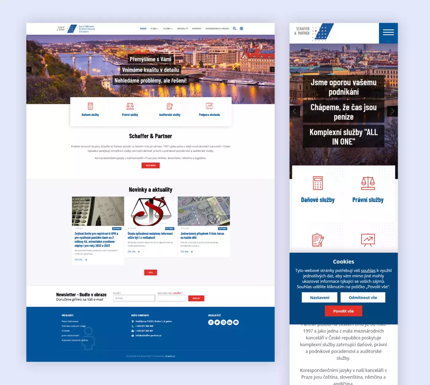 Pro advokátní kancelář Schaffer & Partner jsme vytvořili grafický návrh, které odpovídá jejich firemní identitě a reprezentuje advokátní kancelář. Systém je vytvořen v jazykových mutacích: česky, anglicky, německy, rusky, čínsky, turecky. Propojuje nabídku služeb a kontaktní osoby.