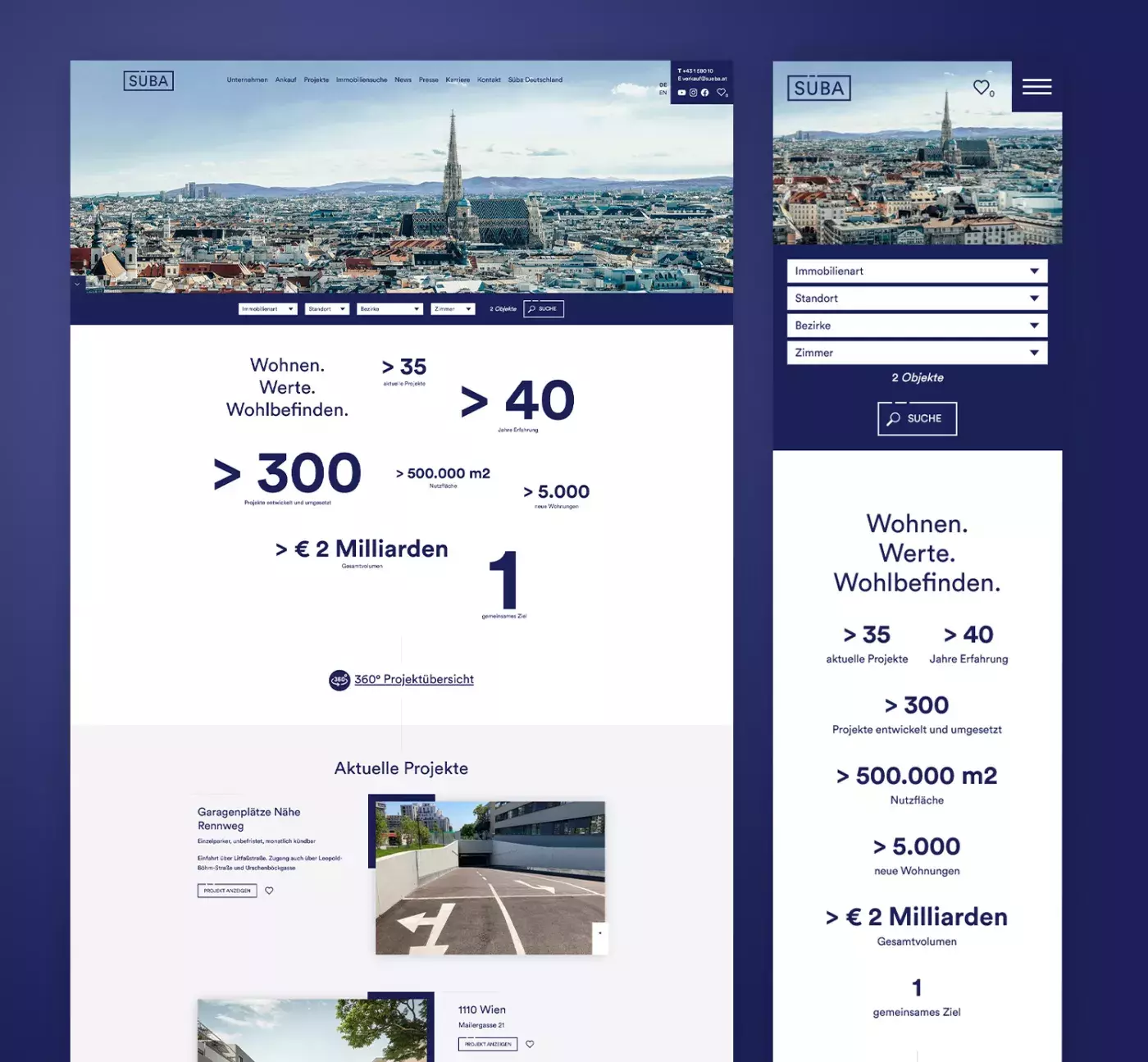Webové stránky rakouského developera. Web je propojen s externí realitní aplikací, ze které získává informace o bytech, které jsou k vyhledání v sekci Immobiliensuche. Tyto objekty jsou pak pravidelně a automaticky aktualizovány z jediného místa. Pro také provázány na jednotlivé projekty, u kterých se z nich vytvořen integrativní navigátor.